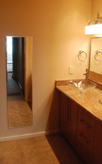 "This remodeling project consisted of completely gutting the interior of this unit. Through the creative eye of Emily Washington (Interior Designer) we added wall sconces and accent lights, removing walls and opening up the unit to capitolize on the water view. Pocket doors with glass transoms above replaced traditional swing doors to reduce wasted space. The kitchen now boasts custom bamboo cabinets with granite counters and Onyx mosaic tile backsplash. The master bath now has clear vessel sinks mounted on granite counters."
